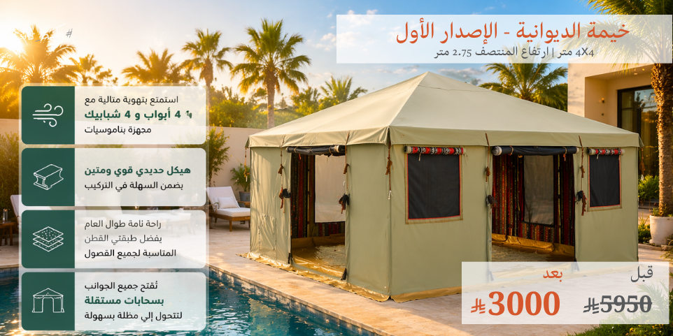 Mekshat Tents, winterized Mabeet Tents, Discovery Tents, Desert Tents, Luxury and Royal Tents, Inflatable and Used Tents, Four Seasons Tents and Mattresses, Sleeping Bags, Jazirah and Rimal sleeping bags, Discovery Gear, Camping Stoves, Outdoor and Beach Chairs, Diwaniyah Tents, Shaqardiyah Shades, Travel Canopies, Bar Camps, and Coffee & Tea Setups – All from Kadi Outdoor.